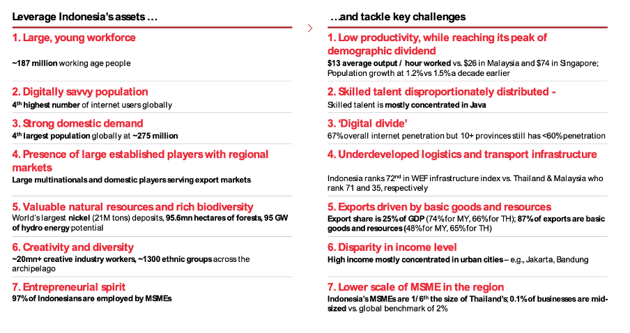One particularly interesting part of the report was a list of Indonesia’s assets and key challenges. These should feature in environmental analyses and SWOT assessments in strategic planning.
