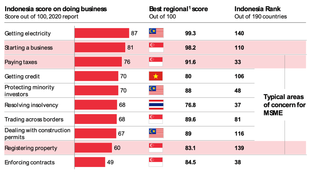 Entrepreneurs unfamiliar with the regulatory landscape might also find the comparative (with its neighbours) analysis of Indonesia’s ease of doing business score interesting.